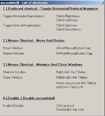 Second Shell is a very small (about 420kb) shell tool that does a very few cool things. The key to what Second Shell does is to allow you make the best use of the screen real estate. You get a number of ways to move, re-size and maximize windows with various hot keys. This works well with windows you commonly use – and even better for those windows that may be un-sizable or fixed. You can even test this on the lone dialog that Second Shell offers (see below). Use the Mouse Shortcuts on this window. I took a quick look at this on Windows 7, and it does work too. Give it a try.