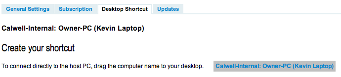 While it’s still in the Logmein Free version, you can really make use of this. You’ll need to generate the shortcut by clicking on the computer properties (the litter gear to the far left on your list). Once you get there, click on that “Desktop Shortcut” tab. The intent is to drag that link in gray to your desktop, but you can also right click on it and say “Copy Shortcut”. What you get is a long unruly link like this: