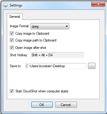 You also want to choose the shortcut keys while on the main window of CloudShot. To do this, simply type the SHIFT+ALT+4 keys and you’ll see the “Shot Hotkey” change to the above image. Click OK, and you’re done.
