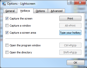2. Open the options window and set what options you’d like. Then, go to the “Hotkeys” tab, turn on “Capture a screen area” and then click on the button that says “Ctrl+Print”