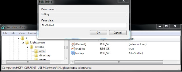 3. Close LightScreen. Open your registry editor and navigate to HKEY_CURRENT_USER\Software\K\Lightscreen\actions\area and change the “hotkey” value from Alt+Shift+$ to Alt+Shift+4. That’s it! Save it. and then open LightScreen again.