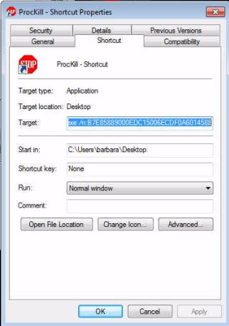 This step is often harder than it seems because some malware opens as multiple processes and or in multiple locations. Even worse, many of load multiple processes and back each other up. What you’re after is making some progress – so go after the main process loaded (so far as you can see). In this case, you still may not be able to use Task Manager or other process killer, so again Prockill can help. What I do is make a shortcut to the Prockill file I’ve downloaded and change the shortcut’s properties to this: