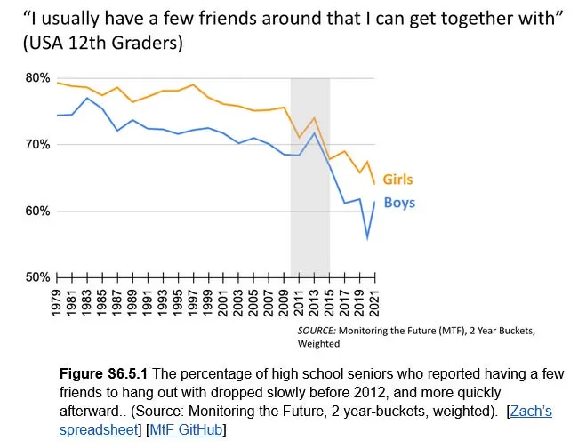 Jonathan Haidt very convincingly argues that social media’s biggest mental impacts with the rise of social media have been on adolescent girls. But, more than that, it’s clear that these disembodied relationships that have evolved from the 2010-ish rise of social media platforms has lead to serious levels of pulling back from real, in-person relationships. The following chart shows how this looks.