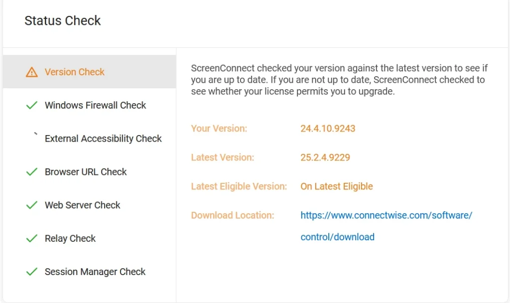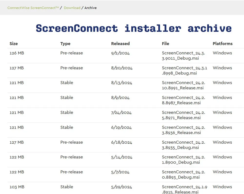 If you elect not to renew maintenance, we have released free security patches for select older versions dating back to release 23.9. Versions of ScreenConnect can be downloaded from the ConnectWise website. The updated releases will have a publish date of April 22nd, 2025, or later. Partners on a version older than 23.9 will be able to upgrade to 23.9 at no additional charge.