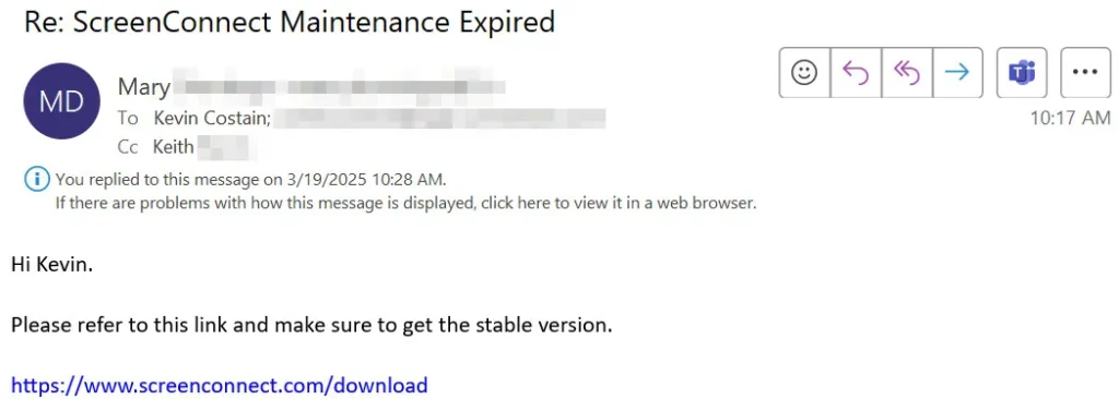 ConnectWise has issued a new security bulletin on our Trust Center concerning a security fix to ScreenConnect versions 25.2.3 and earlier. ScreenConnect versions 25.2.3 and earlier versions can potentially be subject to ViewState code injection attacks. This notice contained a somewhat vague reference to an out-of-band update from the group. This mention looked like this: