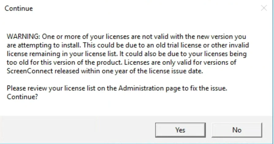 It did turn out I had the newest possible release. The newest version had simply leapfrogged past my eligibility, which itself seems questionable, but there were no releases in the middle I could use. This, of course, could have been the first response from them, but it wasn’t. It was an auspicious end for us and hosting this company’s software. The net-effect here is that we’ve had enough with ScreenConnect. We’re moving away from the platform.