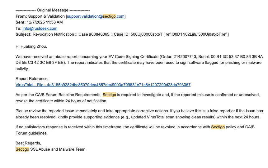Of interest is Sectigo’s phrase, “if the reported misuse is confirmed or unresolved, [Sectigo will] revoke the certificate within 24 hours.” This appears to indicate that if someone else uses the software in a bad way, it’s RuskDesk’s responsibility to stop it or face permanent revocation. This is an absolutely insane standard to put software vendors up to given more utility and portability might mean the bad guys misuse it more. If RustDesk’s fundamentals are secure and sound, this should not be on them to fix how people use it.