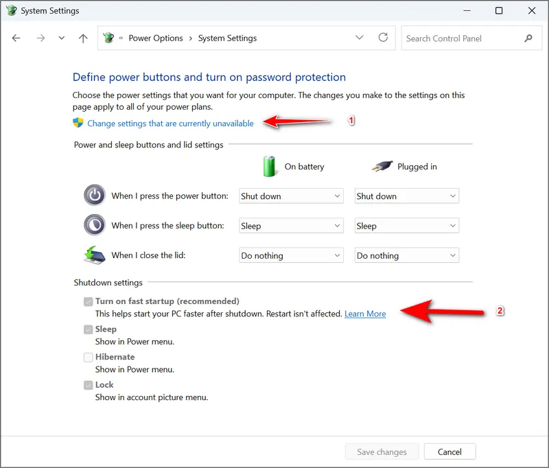 6. You then click the “Change Settings that are currently unavailable” (1 in the below image) and click to remove the check mark next to “Turn on fast startup” (2 in the below image) and then “Save Changes”